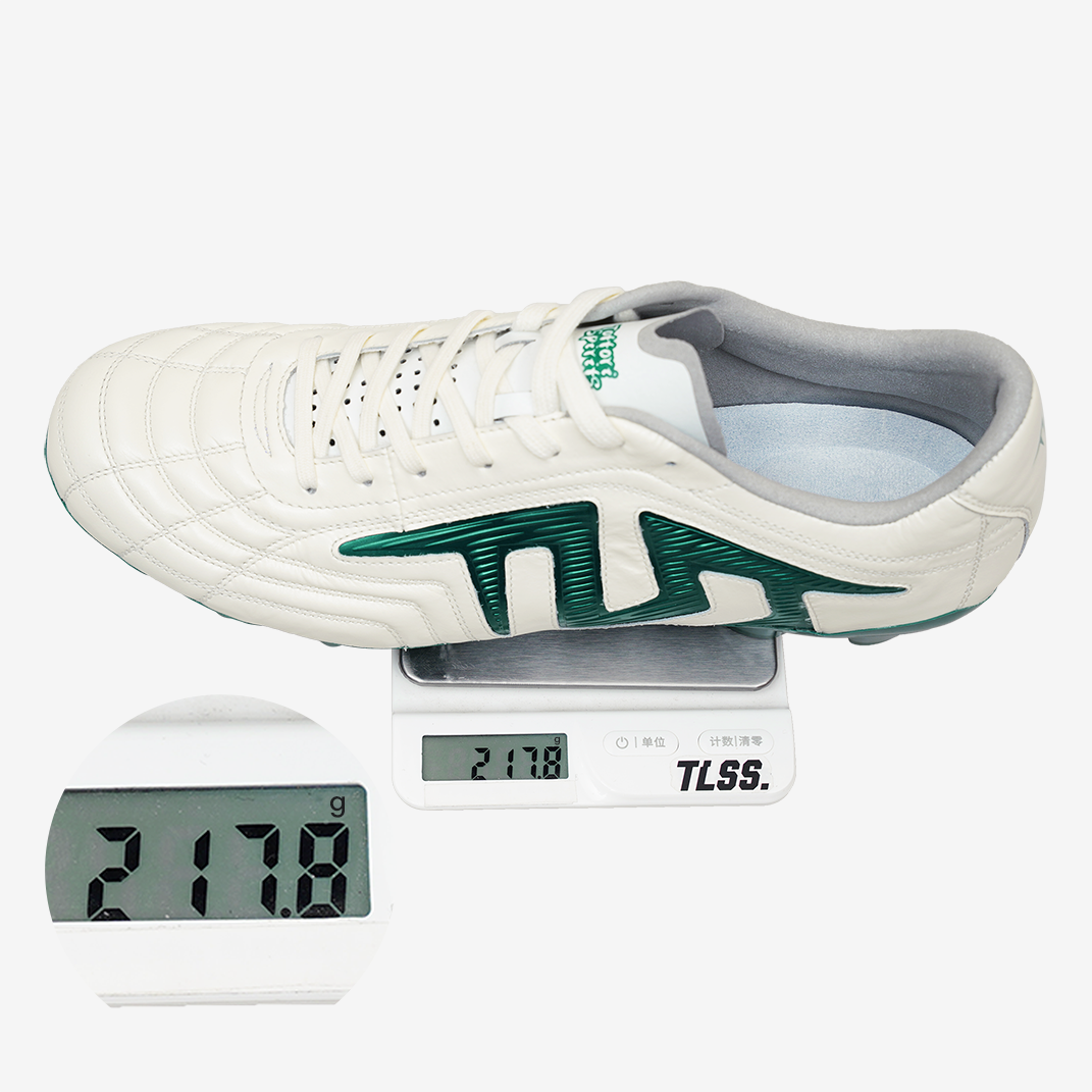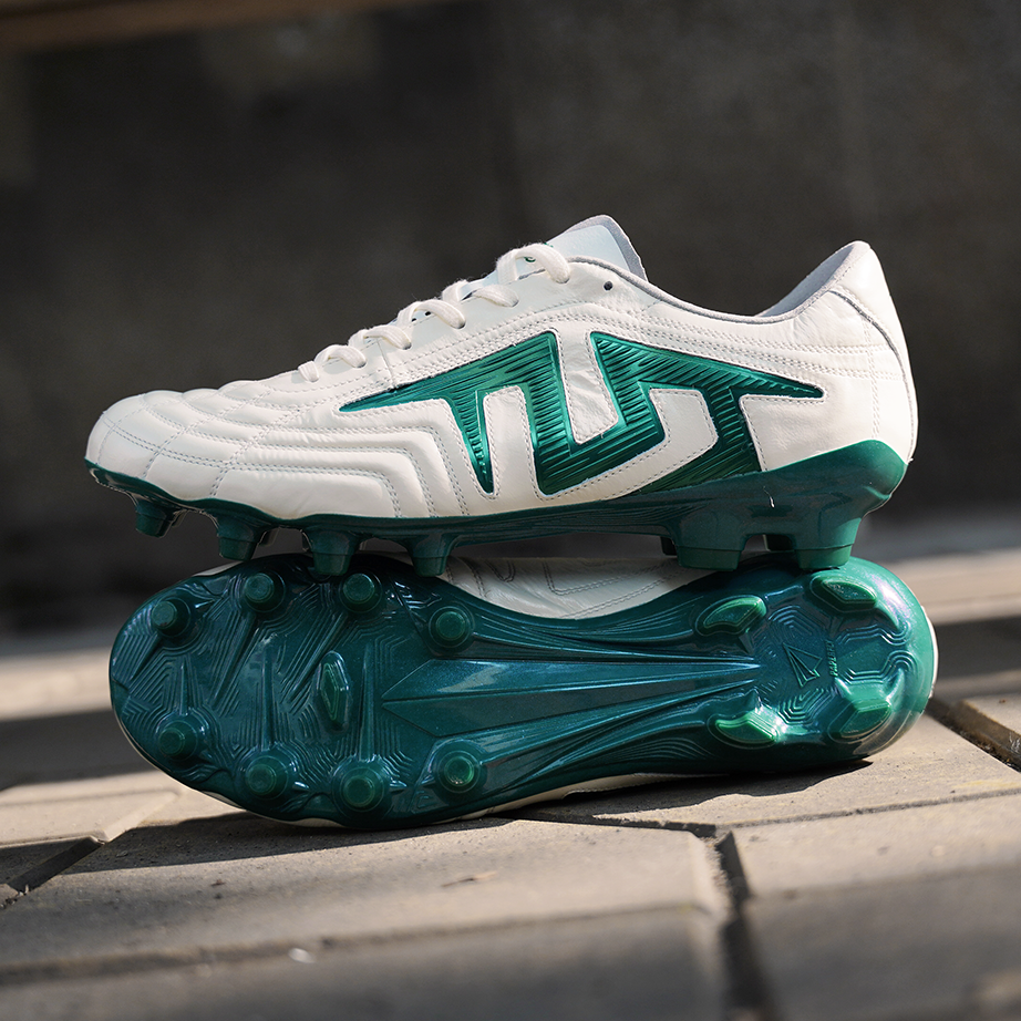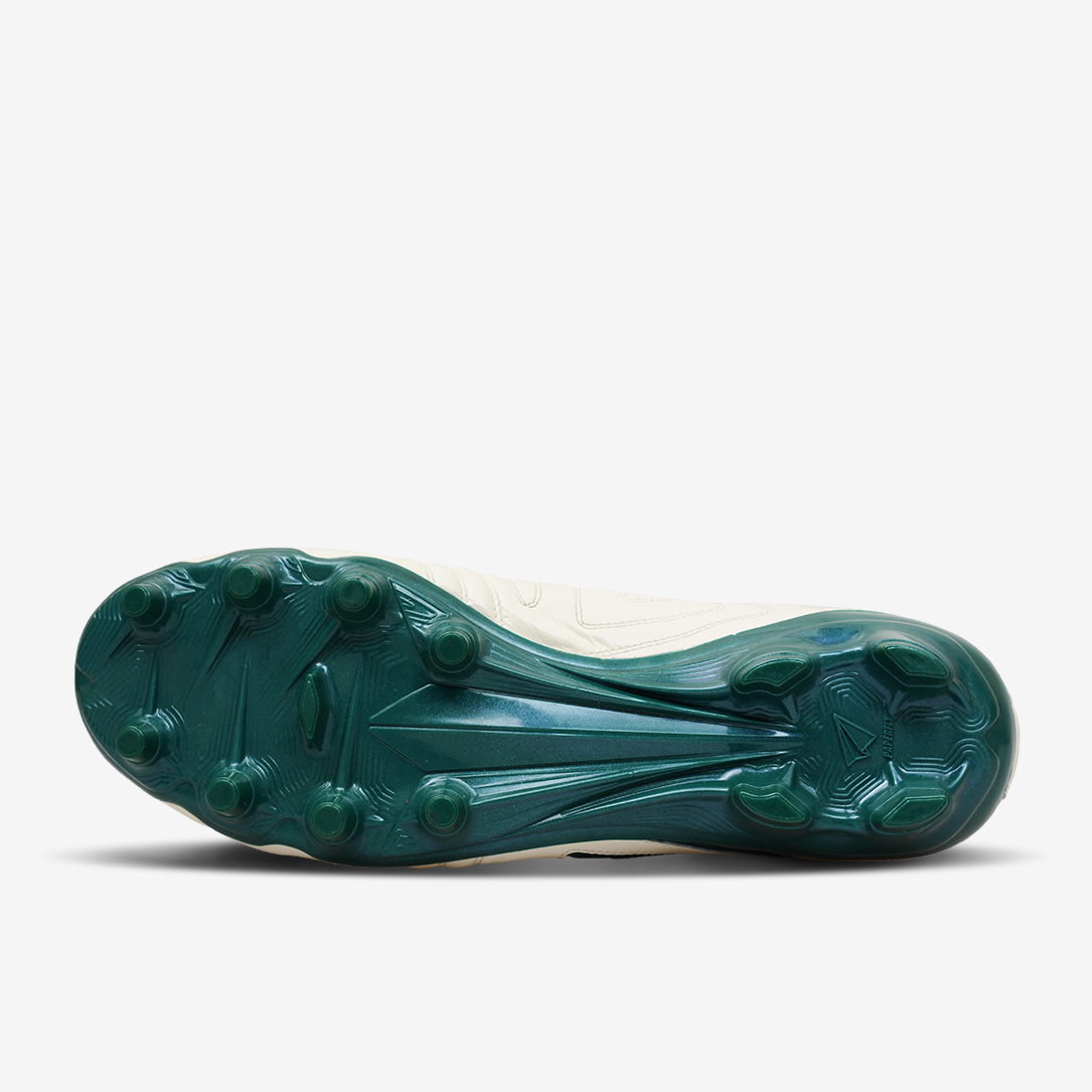 PEBAX+TPU FGスタッドソール:軽量・耐摩耗、天然芝で優れたグリップ力、前足部KaRVOプレートで高反発、中足ねじれ制御、後足安定性